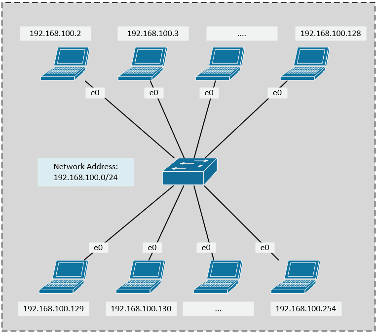 Jadi, dari satu network dengan sebuah broadcast domain yang lebar, kita pecah-pecah menjadi (contoh) 4 broadcast domain.