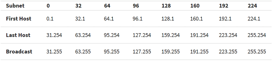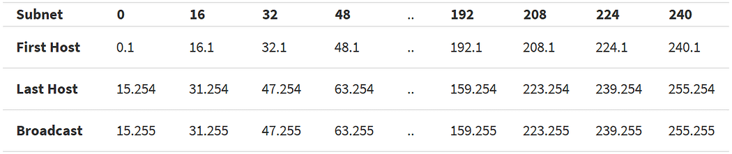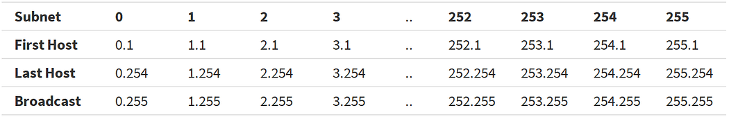 Subnet0.064.0128.0192.0First host0.164.1128.1192.1Last host63.254127.254191.254255.254Broadcast63.255127.255191.255255.255