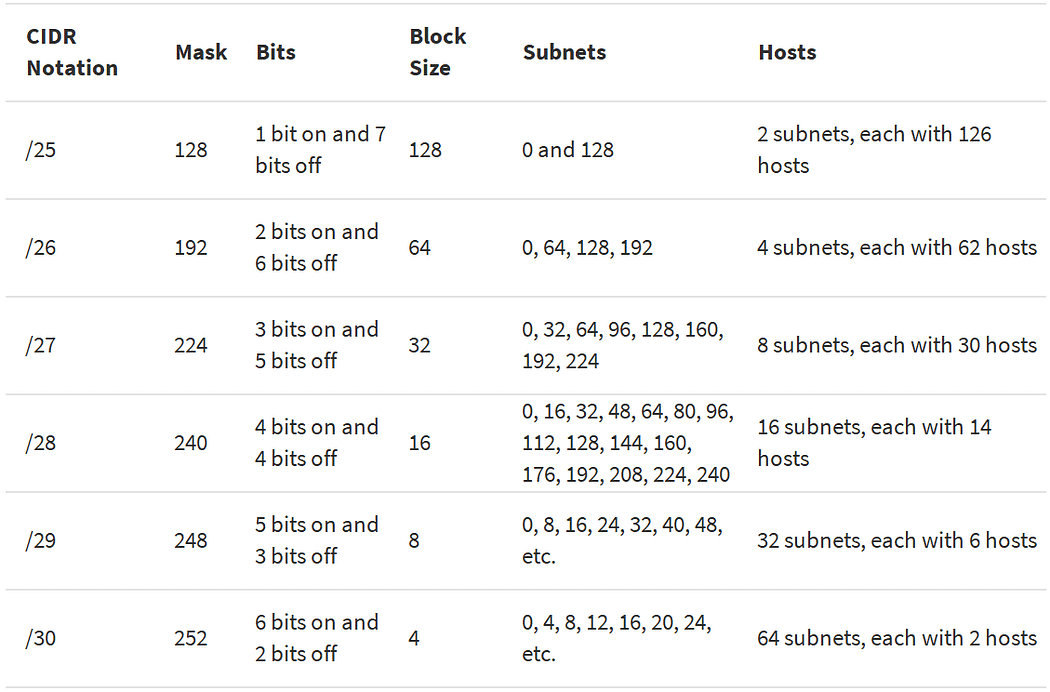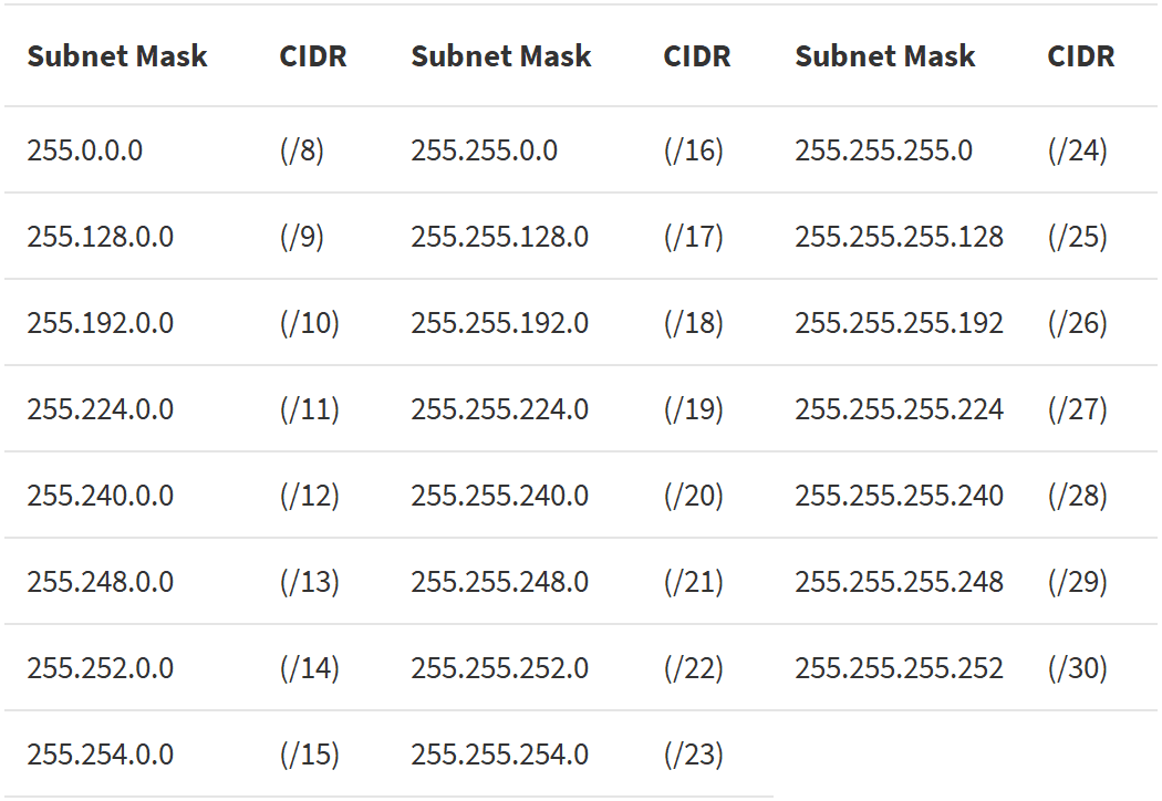 Subnet MaskCIDRSubnet MaskCIDR255.255.0.0(/16)255.255.255.0(/24)255.255.128.0(/17)255.255.255.128(/25)255.255.192.0(/18)255.255.255.192(/26)255.255.224.0(/19)255.255.255.224(/27)255.255.240.0(/20)255.255.255.240(/28)255.255.248.0(/21)255.255.255.248(/29)255.255.252.0(/22)255.255.255.252(/30)255.255.254.0(/23)
