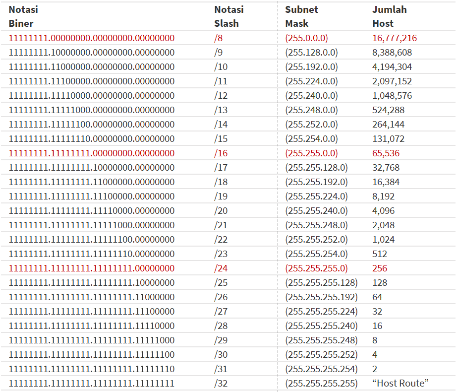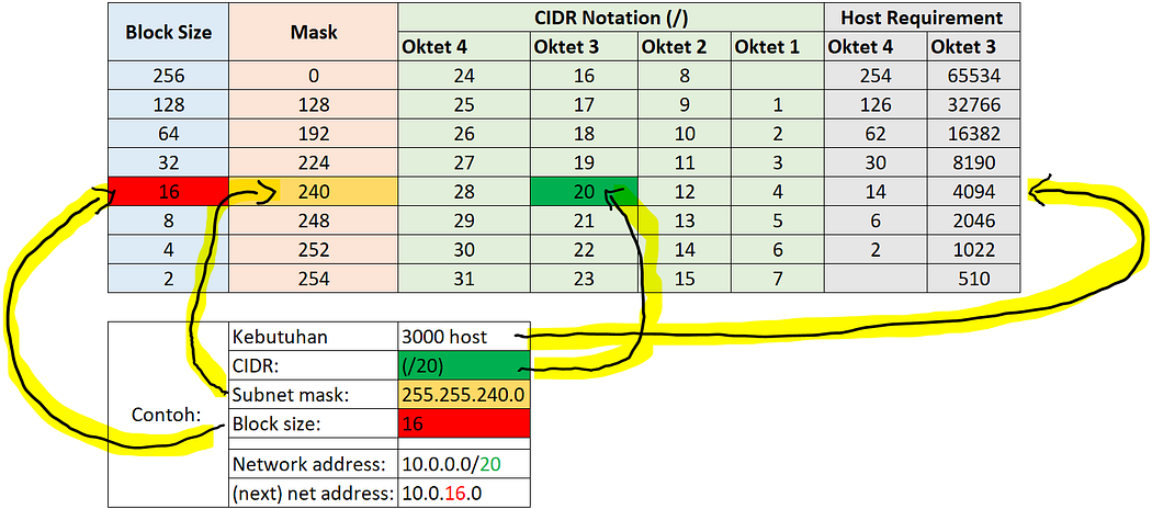 Kalau kamu perhatikan, ada kesamaan block size dan subnet mask di tabel tersebut. Hanya beda peletakan oktetnya saja. (Ingat hukum + dan — angka 8 yang diatas saya singgung).