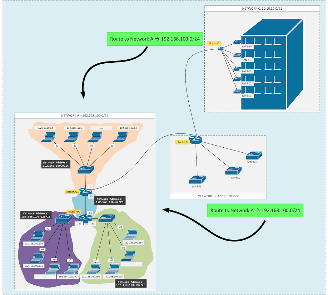 Kecuali memang yang ingin dirouting hanya subnetnya saja, jadi saat routing di Router B atau Router C, destination networknya adalah spesifik ke salah satu subnet /26 diatas.