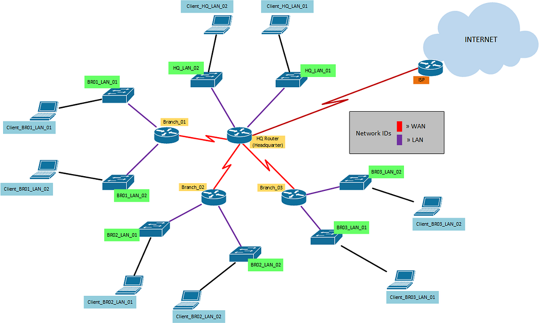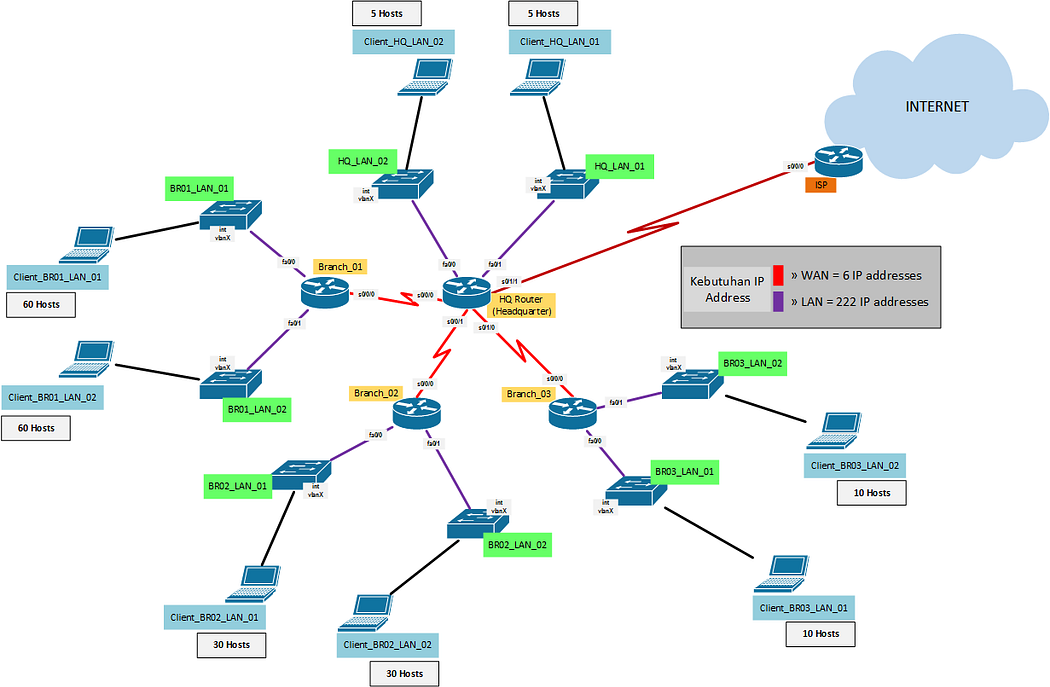 Kemudian tiap Headquarter dan Branch memiliki masing-masing 2 segment LAN dengan jumlah host yang berbeda-beda. Paling banyak ada 120 host.